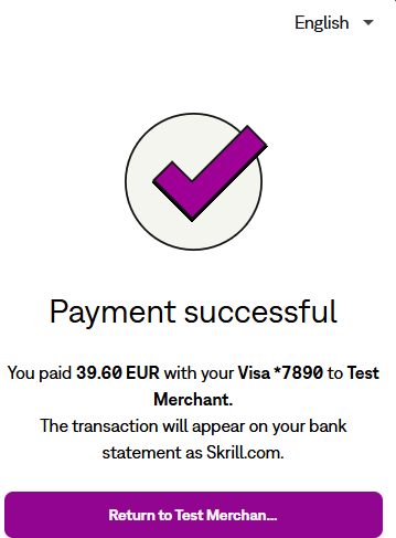 - Skrill displays the Quick Checkout confirmation page, containing the transaction result.
